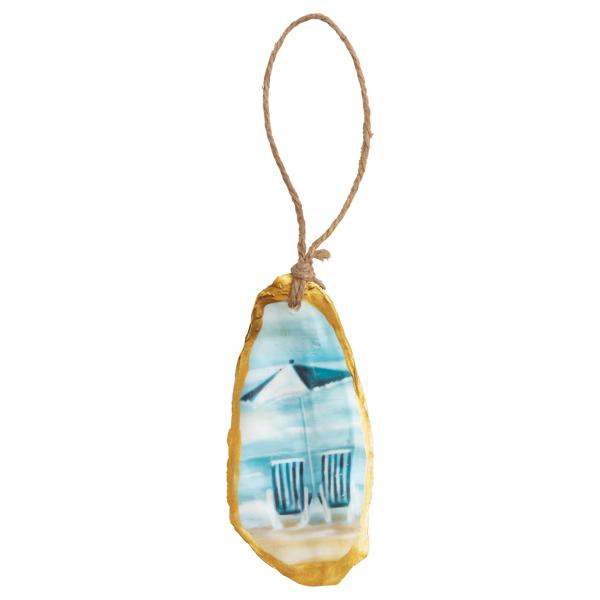 Oyster Beach Chairs Ornament is a charming and unique decorative piece that captures the essence of coastal living. Crafted from genuine oyster shells, each ornament features a beautifully detailed interior scene depicting beach chairs, evoking a sense of relaxation and seaside tranquility. The natural texture and iridescent quality of the oyster shell add a touch of elegance and authenticity to any space. Measuring 2 3/4" x 2", this ornament is the perfect size to adorn your holiday tree, hang in a window, or display as part of a nautical-themed decor. The sturdy jute hanger ensures easy placement and adds a rustic touch, making it a delightful addition to your home or a thoughtful gift for beach lovers and collectors alike.