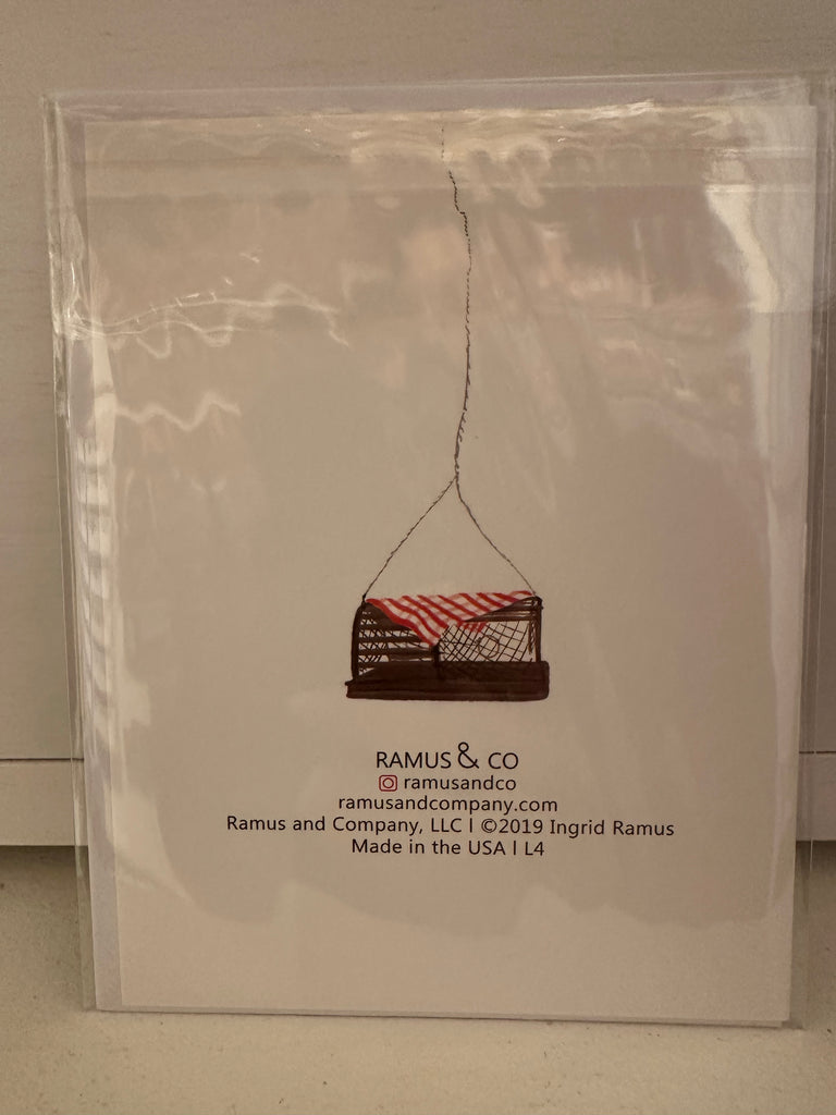 Lobster Date is one of Ramus & Co's favorite cards and a true Best Seller. A fun love card of a couple of lobsters having a romantic date, using a lobster trap as a table. Perfect for a date or to celebrate an anniversary. All our cards are printed on SFI and FSC certified paper. Designed and printed in New England, USA. Beautiful bright white cover paper, blank inside, includes an envelope with peel & stick.