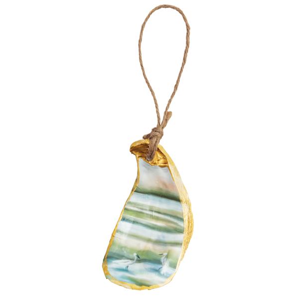 Oyster Marsh Scene Ornament features a beautifully crafted oyster shell with a captivating artwork interior depicting a serene marsh scene. This unique ornament is designed to bring a touch of coastal charm to any space. The natural oyster shell is complemented by a sturdy jute hanger, making it easy to display on a tree, wall, or any decorative setting. Measuring 2 3/4" x 2", this ornament is the perfect size to add a subtle yet striking accent to your home decor. Each piece is crafted with attention to detail, ensuring that no two ornaments are exactly alike, offering a one-of-a-kind addition to your collection. Ideal for those who appreciate the beauty of nature and the artistry of handcrafted items, this oyster shell ornament is a delightful gift for friends, family, or yourself.