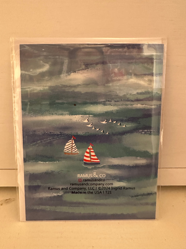 Say thank you in style with this charming card featuring a delightful regatta scene, where colorful boats gracefully glide across the water. "Thanks so much." All our cards are printed on SFI and FSC certified paper. Designed and printed in New England, USA. Beautiful bright white cover paper, blank inside, includes an envelope with peel & stick.