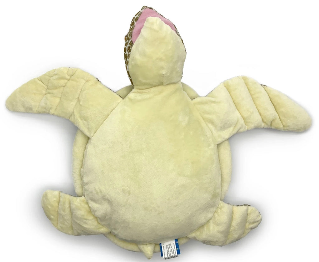 Gus, the soft and cuddle plush turtle toy, from the Turtle Trips storybook as well as the Turtle Tracks storybook, has his mouth open, ready to nibble fingers and graze on seagrass! Young ones love snuggling up with Gus while reading of his adventures in the bay where he meets curious children swimming nearby and a hatchling release about to take place.